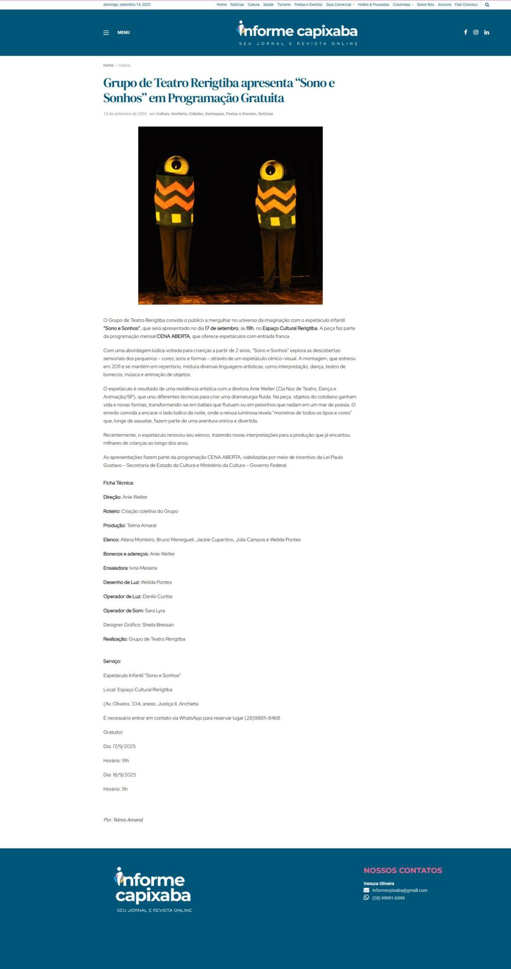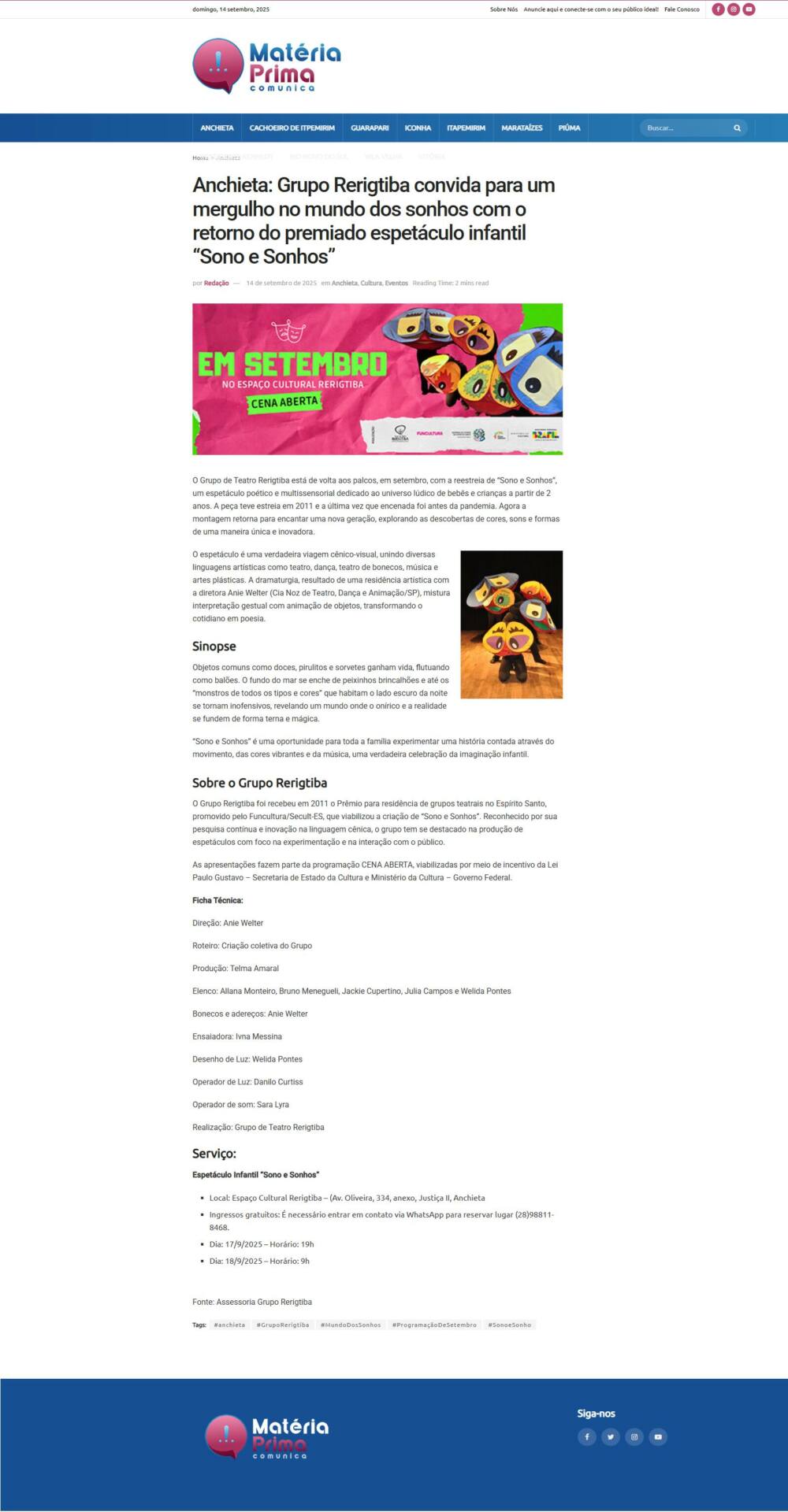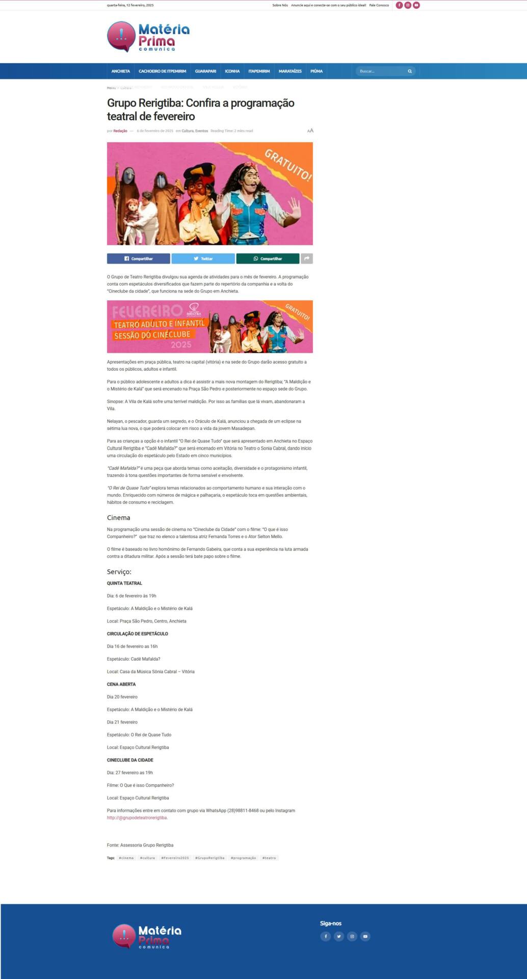 A programação conta com espetáculos diversificados que fazem parte do repertório do Grupo Rerigtiba, com acesso gratuito a todos os públicos, adultos e infantil, estudantes da rede pública e público em geral.